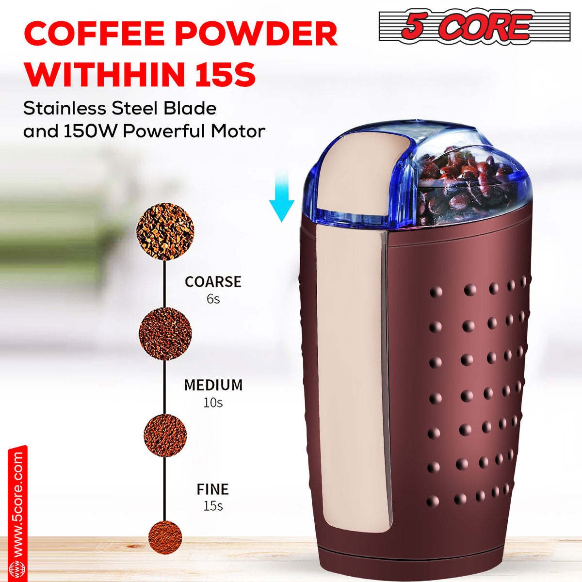 Home > 5 Core Coffee Grinder • 85 Gram Or 3 Ounces / 12 Cup Capacity • One-Touch Automatic Electric Bean Spice Grinding Machine • 150W Copper Motor • Stainle
