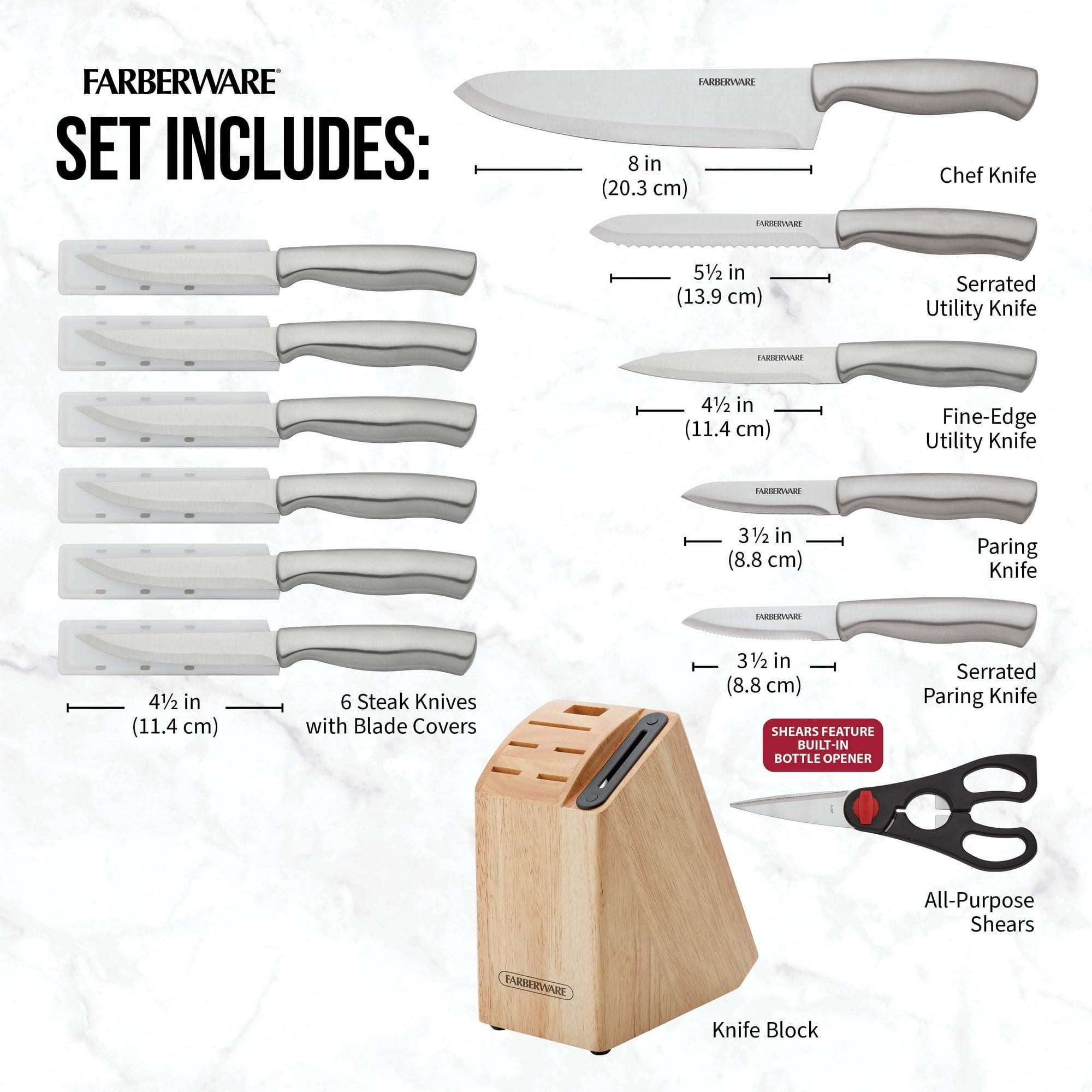 ERGONOMIC HANDLES: These handles are crafted from stainless steel and are ergonomically designed for a comfortable grip; each knife is perfectly balanced for precision while cutting.Farberware 13-Piece Knife Block Set with Built-in Sharpener and In-Drawer Steak Knives, Natural: 5306073