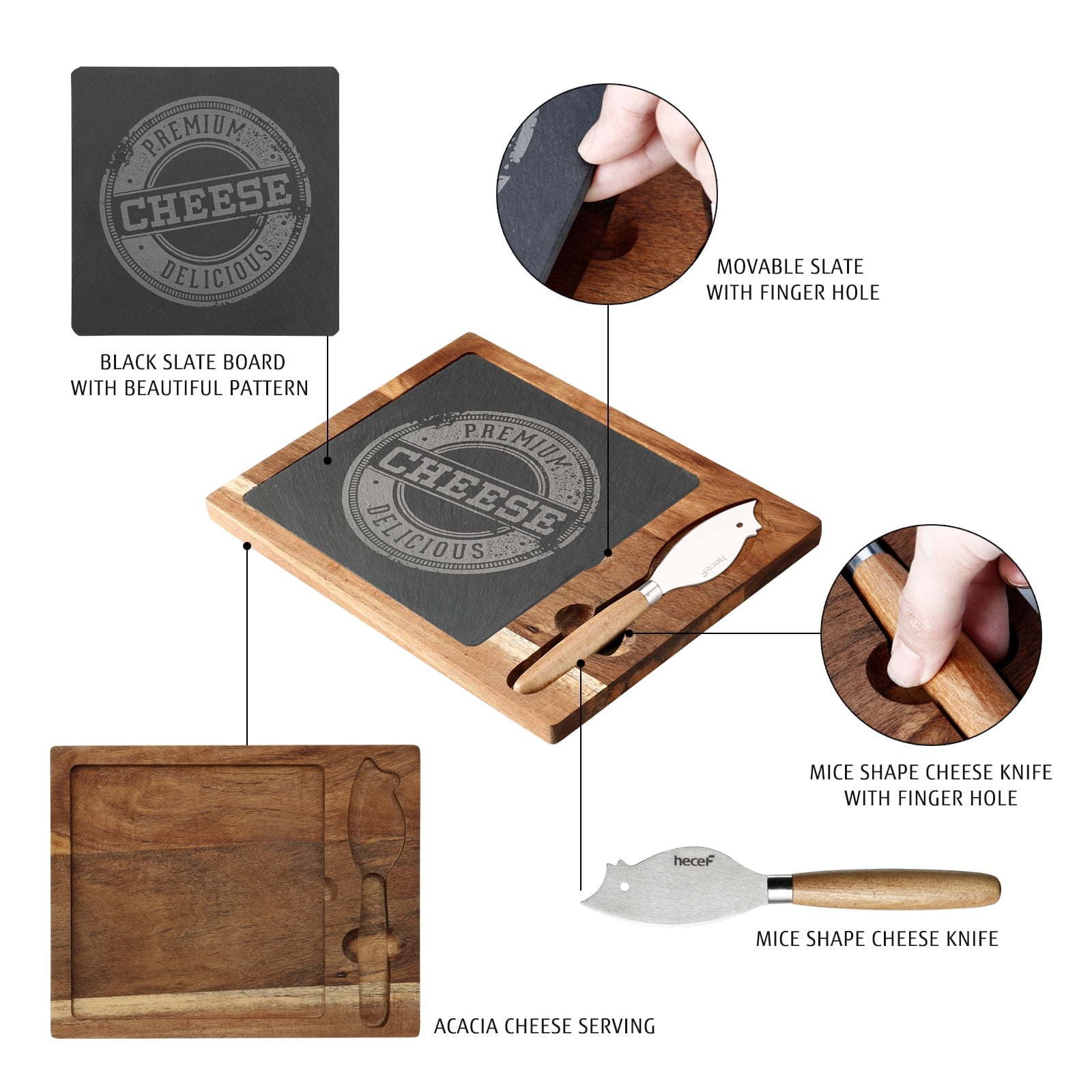 Hecef Acacia Wood Cheese Board Set, with Black Slate & Cheese knife, Wooden Charcuterie Platter & Serving Tray for Cheese, Crackers and Meat, ideal Gift.