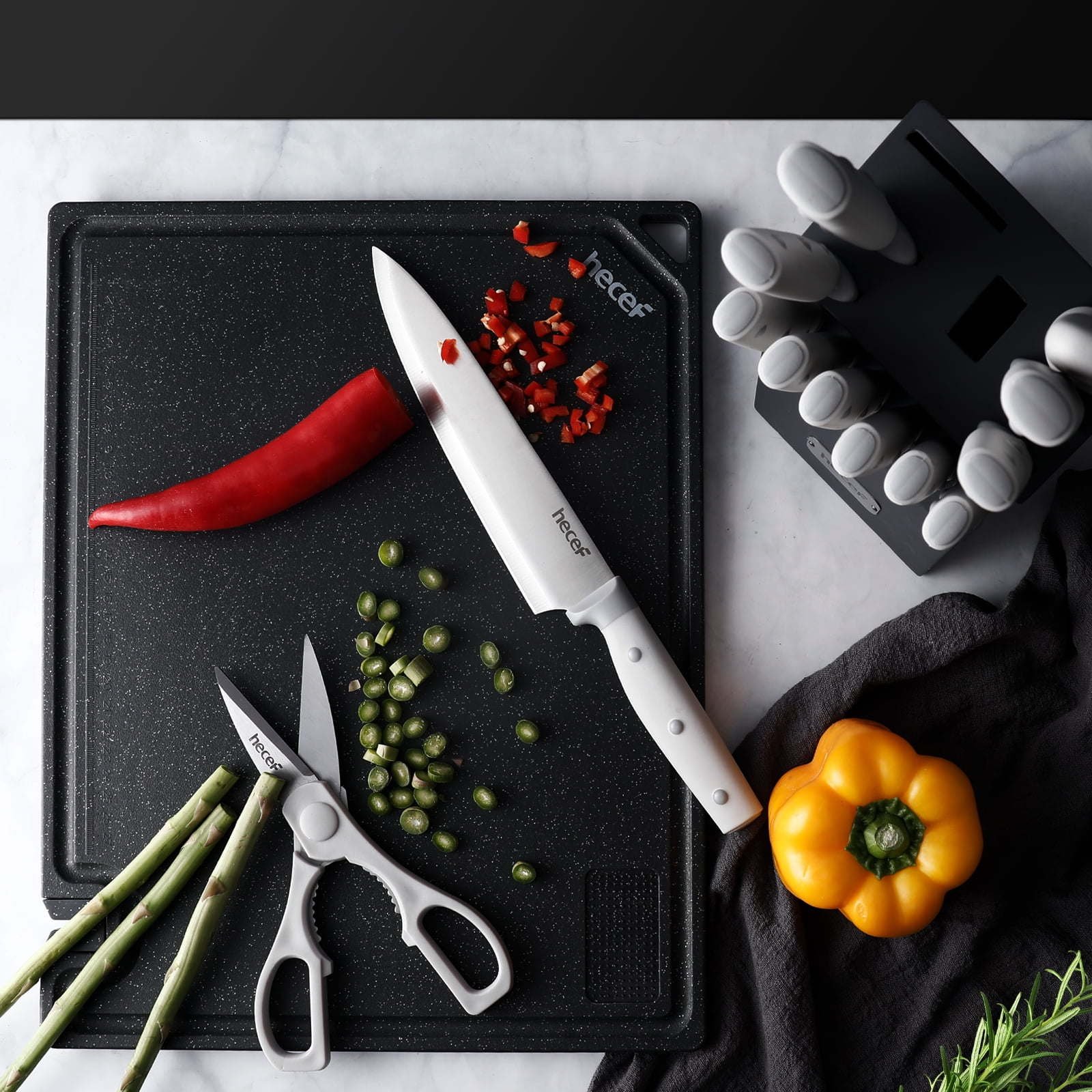 Hecef Kitchen Knife Set of 14 Premium Stainless Steel with Wooden Block, Comfort Grip