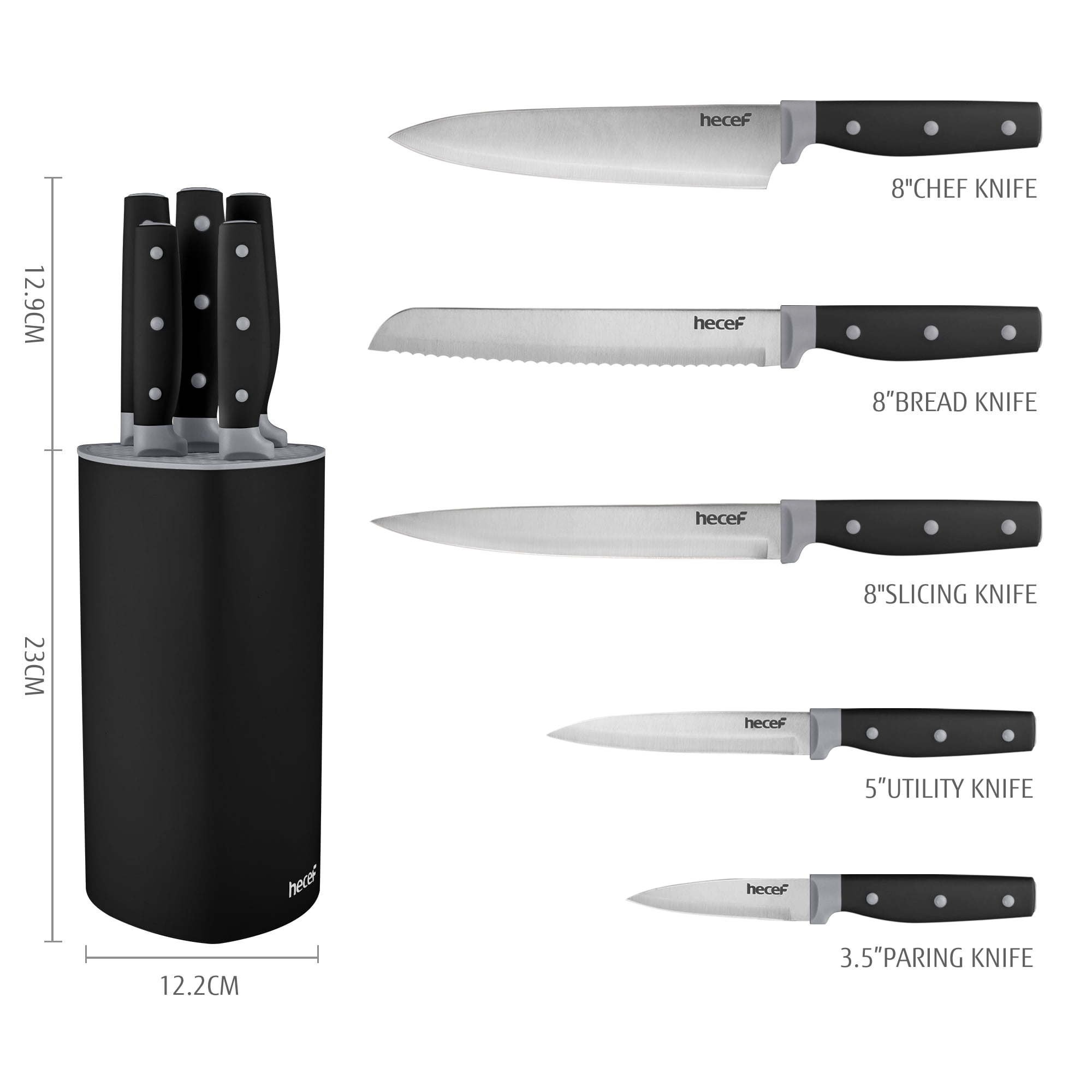 Hecef 6 piece essential knife block set includes chef's knife, cutting knife, bread knife, utility knife, paring knife and knife block, is a great investment that can meet all your slicing needs.