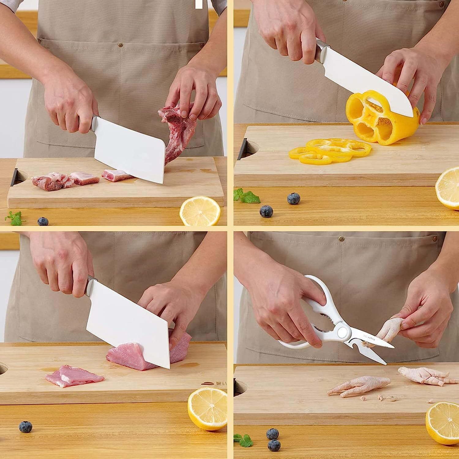 [All-In-One]This 6-piece set of white multifunctional kitchen knives includes: cleaver knife, slicing knife, chef knife, scissors, sharpener, knife block. All-in-one multifunctional kitchen knife set, fully meet the daily kitchen cutting needs and help you easily complete kitchen cooking tasks.