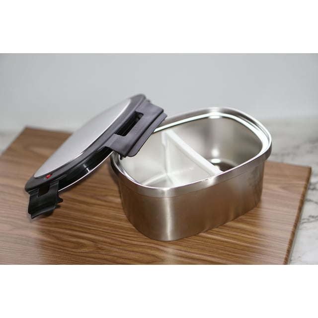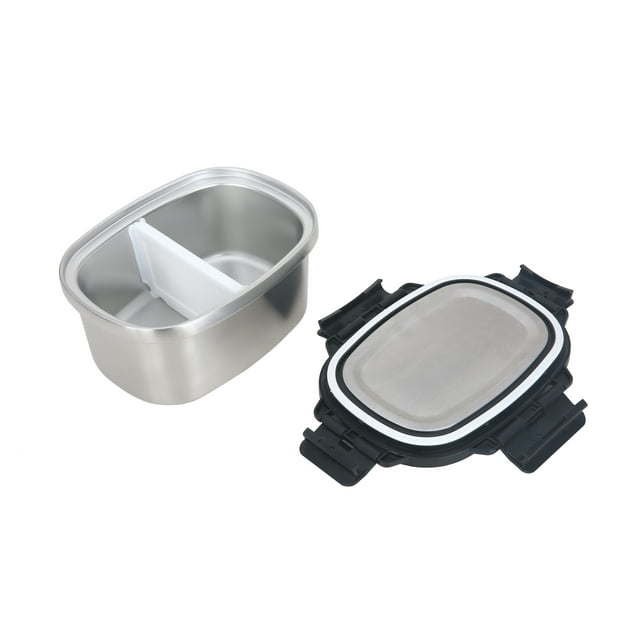 Keep meals and snacks at the proper temperature with the Mainstays 33 oz rectangular insulated food container. Made from food-safe 18/8 stainless steel with air-tight seals, this container features double-wall insulation to maintain hot or cold temperatures for hours with a removable divider to keep foods separated. The slim rectangular shape includes a sturdy carry handle and fits easily in lunchboxes and bags. Use it to carry soups, entrees, salads, snacks and more to work or school. The stainless steel material won't absorb food odors or flavors. Durable enough for everyday use, this insulated container makes transporting perishable foods easy.