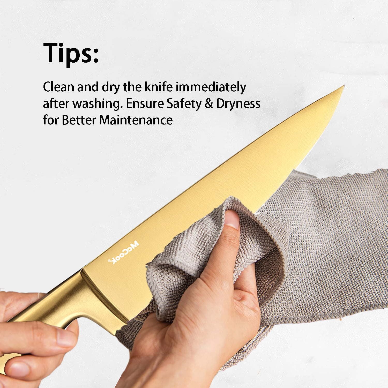 NON-STICK & RUST-RESISTANT:The golden titanium coating prevents the steel from oxidizing, so kitchen knife set will stay non-stick and rust-resistant for years to come. Easy to clean: hand wash for best result.