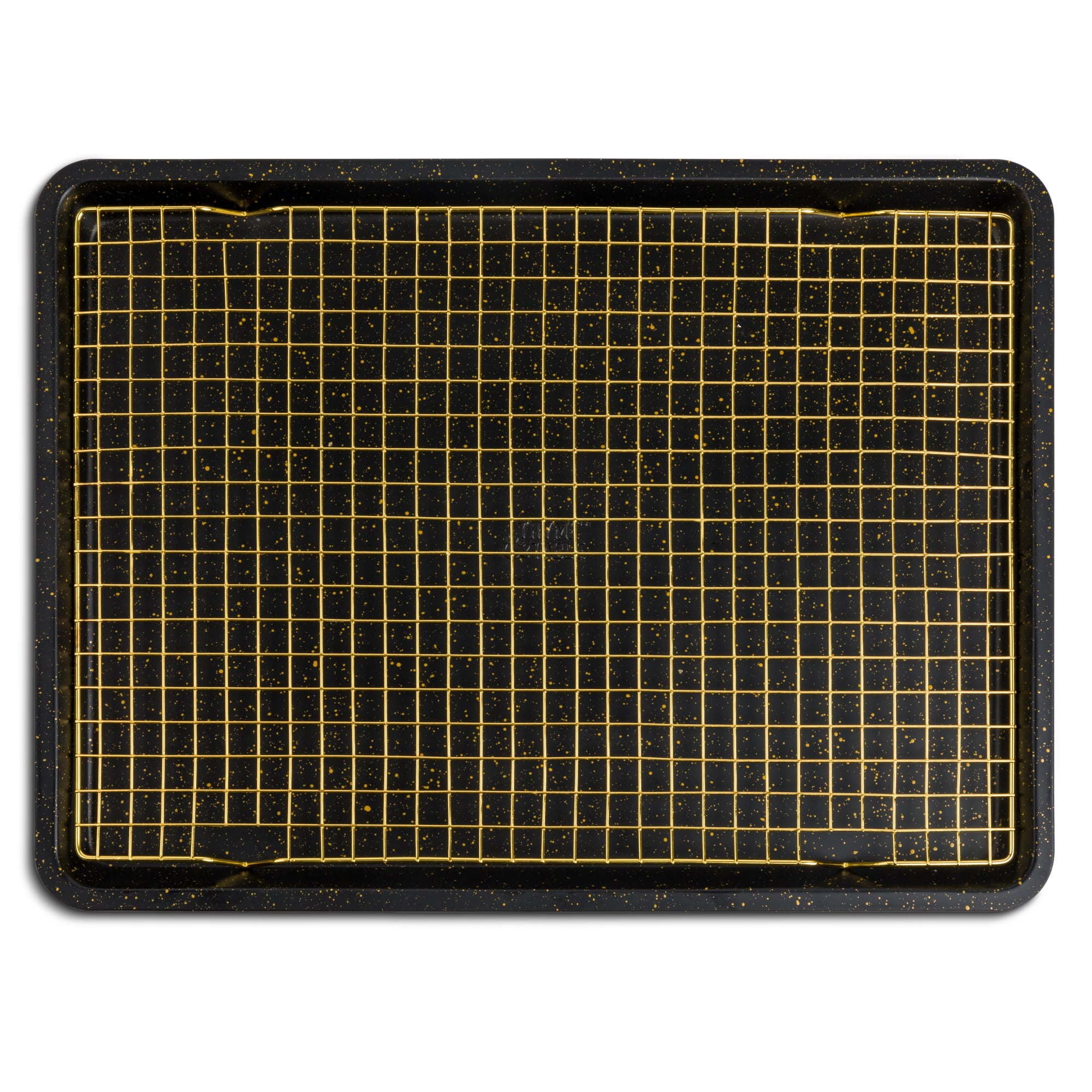 Thyme & Table 12 x 17 Nonstick Baking Sheet & Cooling Rack Set, Black the perfect combination of style and functionality for your kitchen. This set is crafted from high-quality materials and designed to meet all your baking needs. The baking sheet is made from heavy-duty aluminized steel, which ensures even heat distribution and long-lasting durability. The non-stick coating allows for easy release of food and makes cleaning a breeze. The sheet is also designed with a raised edge to prevent spills and drips, ensuring that your oven stays clean. The included cooling rack is made from stainless steel and fits perfectly inside the baking sheet. For care & ensuring the product's longevity, please hand wash in warm water with a soft sponge and dish soap.