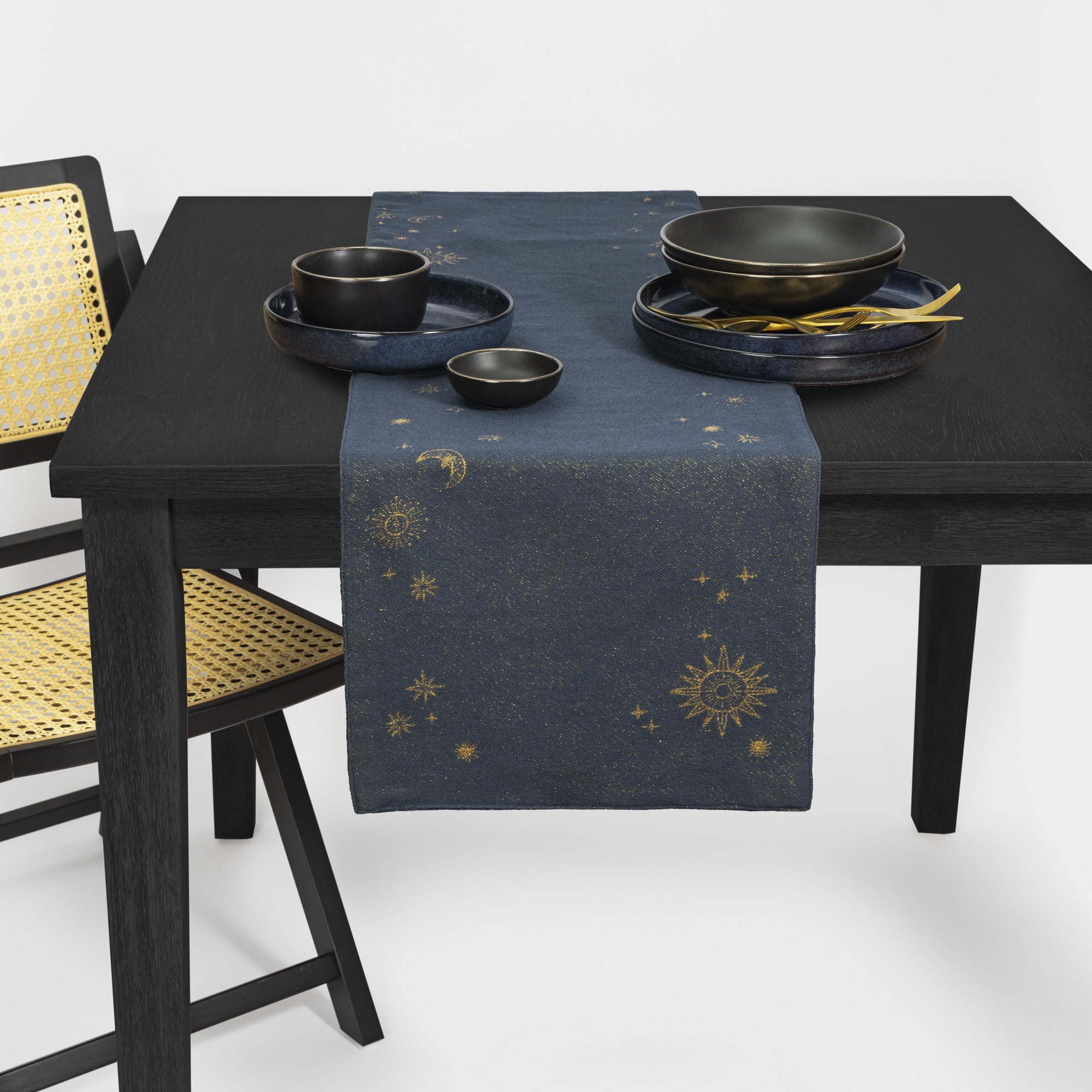 Transform your dining experience with the Thyme & Table 72" Celestial Table Runner. Crafted to enchant and inspire, this table runner features a mesmerizing celestial print that adds a touch of magic to any meal. The deep blue background sets the stage for a celestial scene with gold accents. Perfect for special occasions or everyday dining, this table runner brings a sense of wonder and elegance to your table setting. Made from high-quality materials, it offers durability and easy maintenance, ensuring lasting beauty for years to come. Whether you're hosting a dinner party or enjoying a quiet family meal, let the Thyme & Table 72" Celestial Table Runner be the focal point of your dining experience, creating an atmosphere of enchantment and delight.