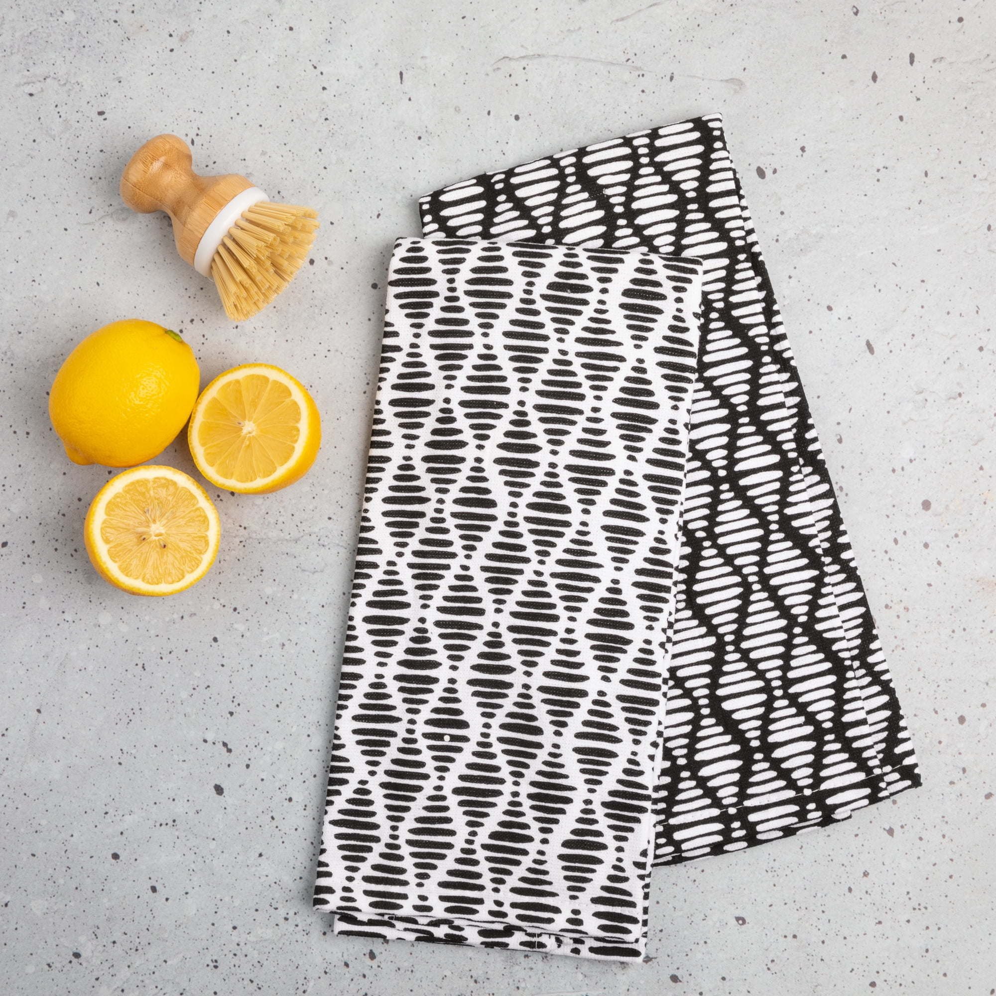 Thyme & Table Cotton Terry Kitchen Towels, Black White, 2-Piece Set is a part of Thyme & Table's Geo Collection. These kitchen towels are soft and durable and are made of 100% absorbent cotton terry. The cotton towels are machine washable and will be long lasting. The towels measure 28" x 16". With a fun print, these towels are sure to add a pop of style to any kitchen. Care and use: machine wash in cold water with like colors. Dark colors may bleed. Gentle cycle. Do not bleach and do not iron. Tumble dry low.