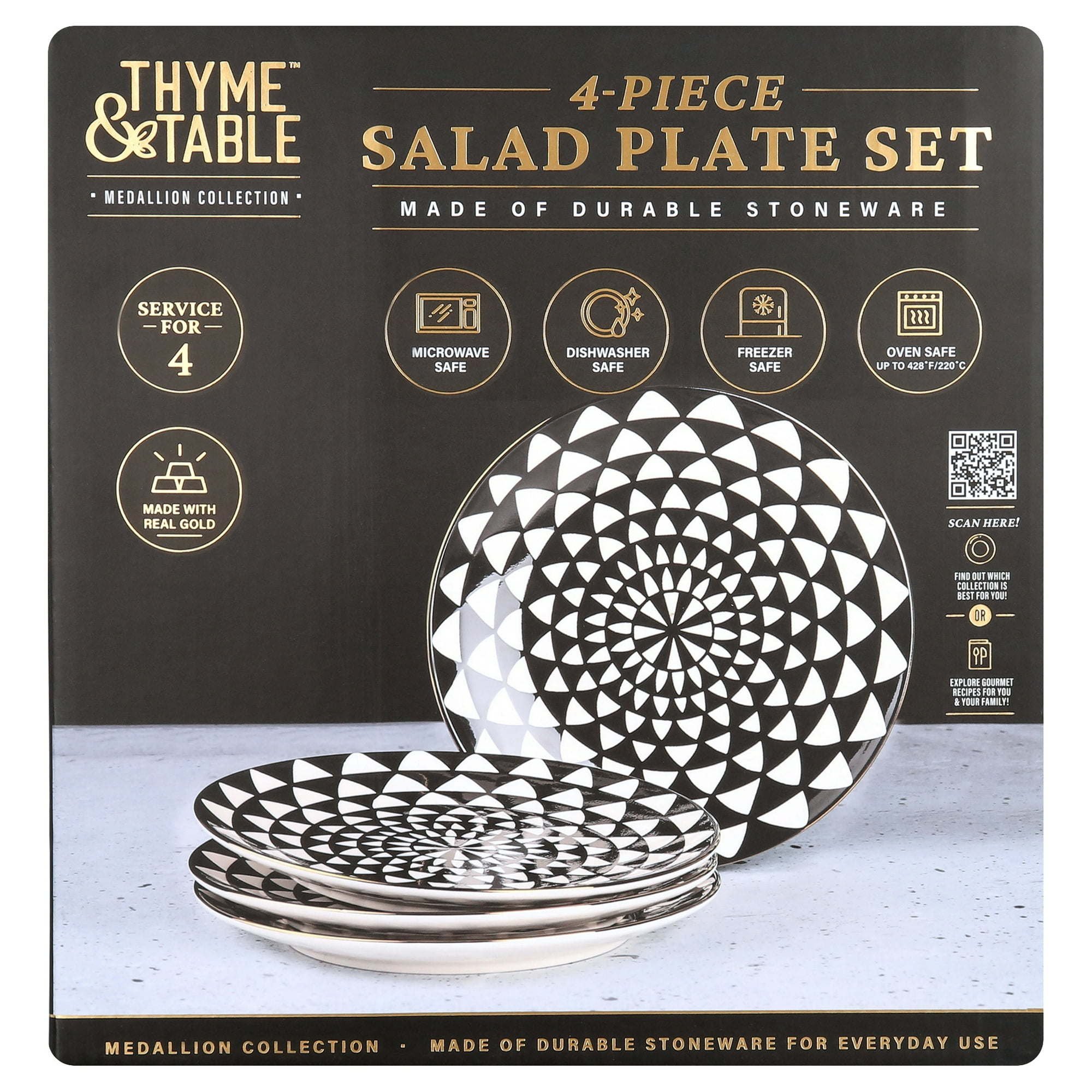 Home > Thyme & Table Dinnerware Black & White Medallion Stoneware Salad Round Plates, 4 Pack